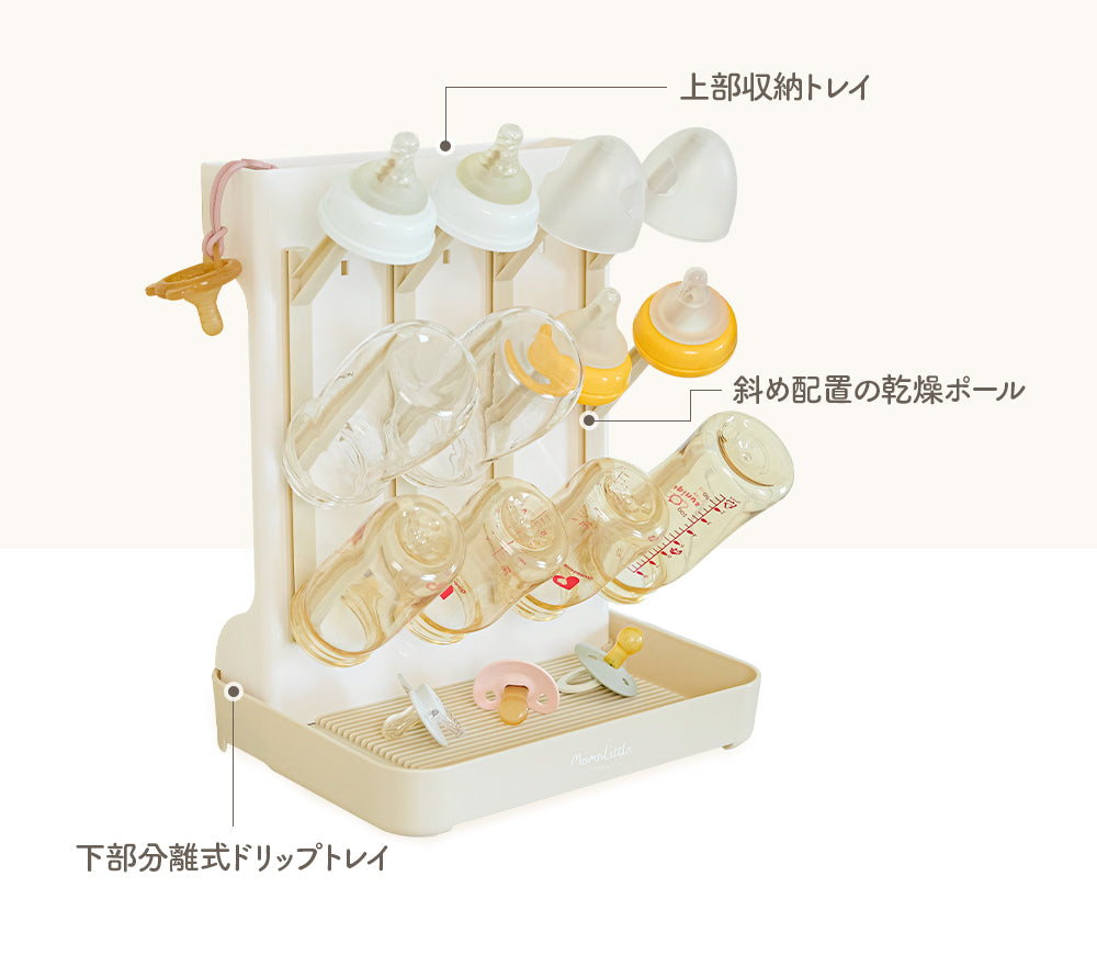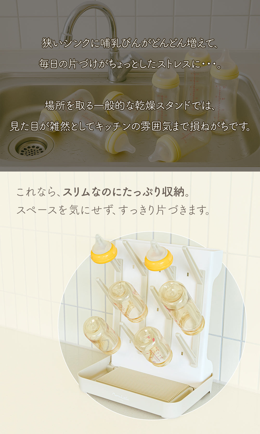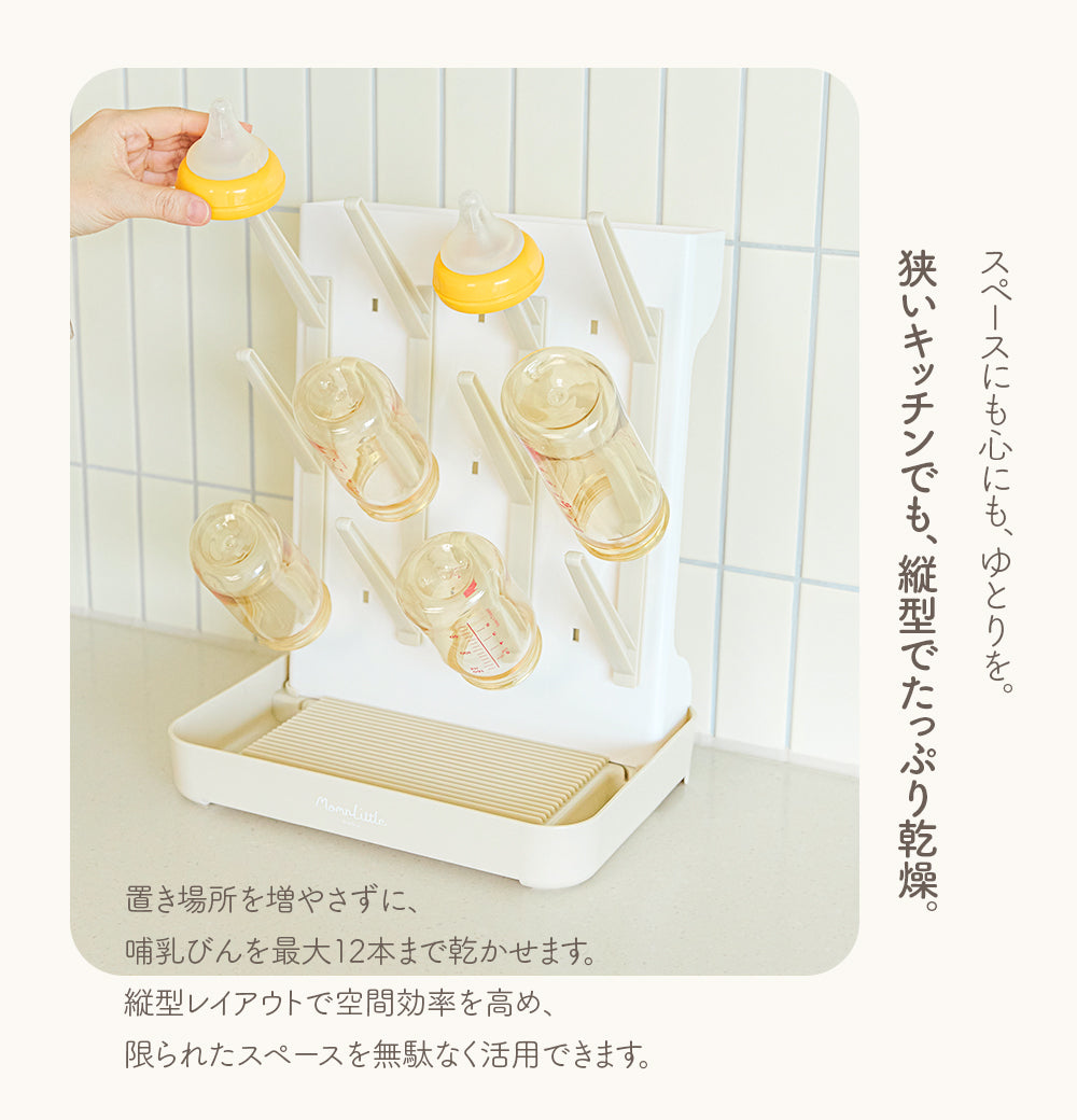 ・縦型デザインで、哺乳びんを最大12本まで乾燥できます。