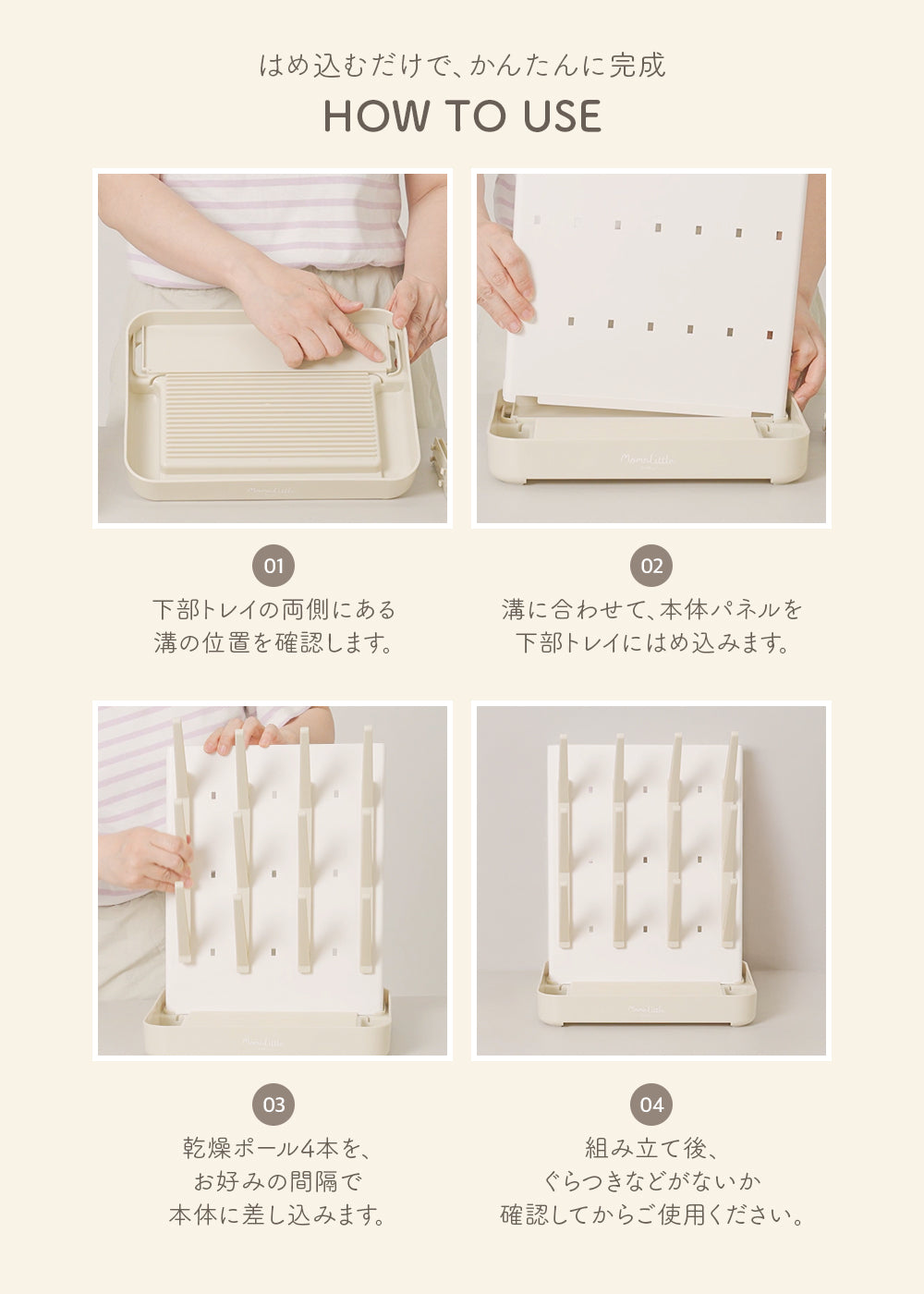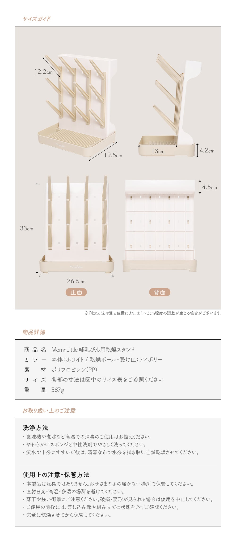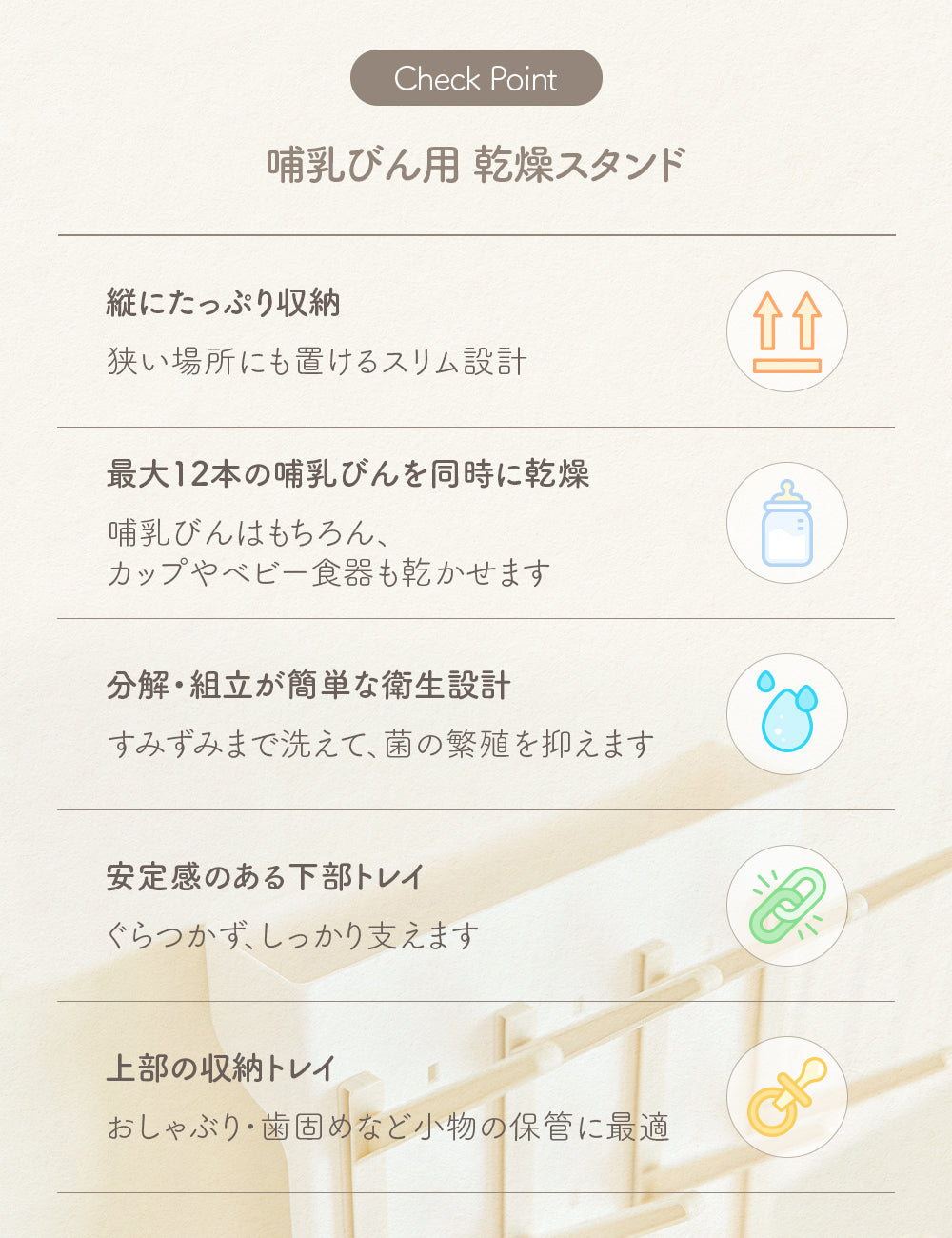 ・縦型デザインで、哺乳びんを最大12本まで乾燥できます。